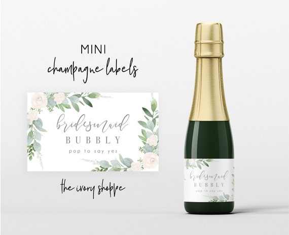 Wine and Mini Champagne Bottle Labels to Enhance Your Next Event Pre-Printed Champagne Labels This bridesmaid proposal wine label is simple but effective as it's straight to the point. It includes a white background with the text, "Will you be my bridesmaid?" in black. This classy white label would look especially nice against a light pink bottle of rosé. Greenery Bridesmaid Proposal Wine Labels