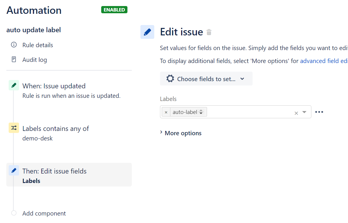 How to add new labels in jira. Solved: Adding a new label to existing labels on issue usi... 1) read the existing labels 2) append the new label I want to set to json 3) set the json as new label for the issue KInd Regards Manas Watch Like Be the first to like this 399 views 1 answer 1 accepted 0 votes Answer accepted Fazila Ashraf Community Leader May 27, 2021 Hi @Sahoo Manas (SEIT) An automation like this helps? Jira 8.22.6 - Atlassian Welcome to the Jira Server platform REST API reference. You can use this REST API to build apps for Jira, develop integrations between Jira and other applications, or script interactions with Jira. This page documents the REST resources available in Jira Server platform, along with expected HTTP response codes and sample requests. support.atlassian.com › jira-work-management › docsWhat is the issue view? | Jira Work Management Cloud ... Quickly add related content to an issue. The quick-add buttons are right under the issue summary, always there for you to save time and add context for your team. Use them to add attachments and subtasks, and to link to issues, Confluence pages (if you have Confluence), web links, and content from Atlassian Marketplace apps. Jira labels - the ultimate guide - Polymetis Apps How to create labels in Jira. That's super easy, to add a label simply follows these steps: Open an issue that you want to add a label to. Click on the label field or hit the 'l' key as a shortcut. Start typing! Jira will suggest labels that are already in use in your instance, making it easy to stay consistent.